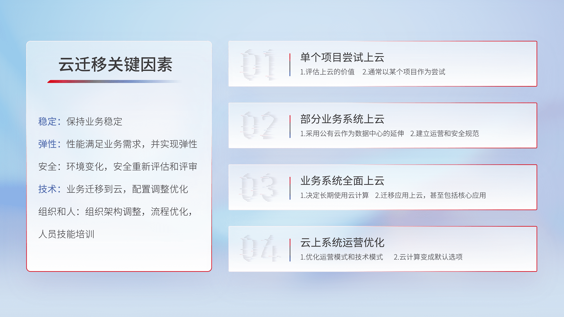 结合实际业务,,,,从规划设计、、云平台选型、、云原生改造、、、、数据迁移、、、、集成交付,,,迁移全过程为客户识别最佳上云路径,,做好风险识别管理,,,设计网络架构、、、、身份权限、、、安全审计合规、、、操作审计、、日志审计、、、监控告警策略、、、、多站点容灾设计等,,对云上基础设施进行整体规划,,提升IT治理水平,,,以满足弹性、、高可用、、高性能的需求。。。
