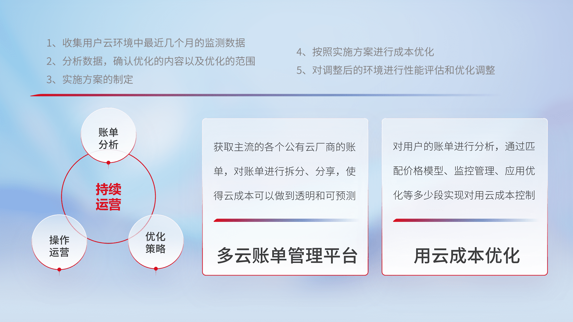 通过多云纳管,,以统一的资源数据模型把客户的云资源进行抽象和封装,,,进而实现对多云资源的统一操作,,,,保障云资源管理的可靠性、、、、稳定性与可用性。。。。量身定制化运维内容,,,配置、、开发运维、、、补丁管理、、备份、、监控、、认证和访问管理、、、审计和日常巡检等,,保障在用云过程中的可靠度,,,,稳定度以及高可用率。。。